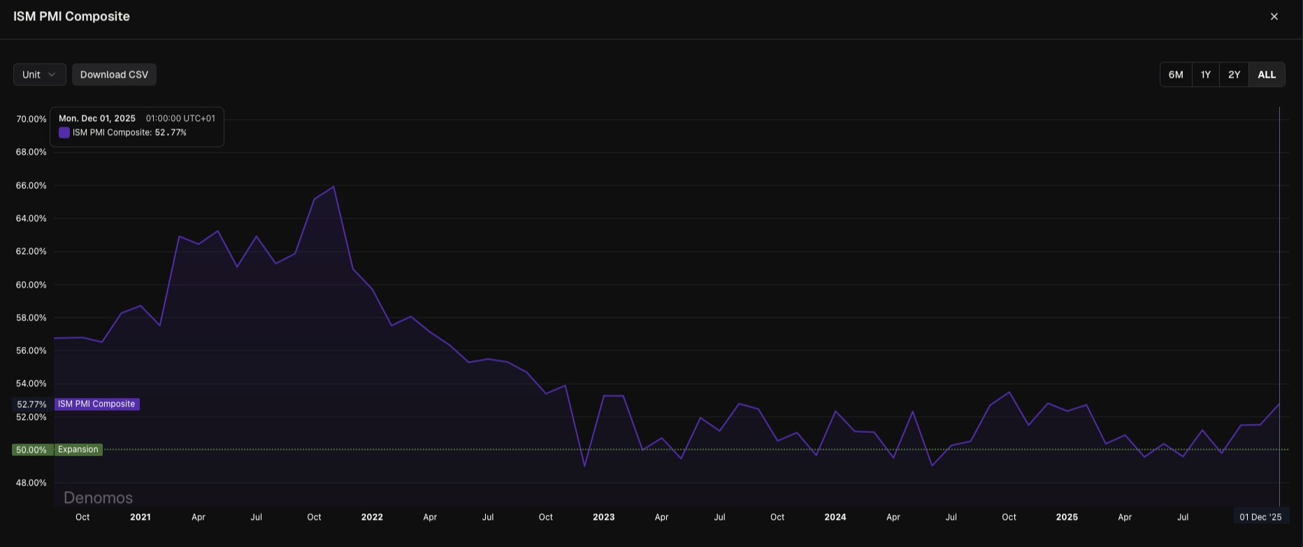 Within this framework, I use PMI as the central indicator of the business cycle. More specifically, I rely on the ISM PMI Composite (calculated by Denomos), which combines the manufacturing and services sectors and therefore better reflects the structure of the U.S. economy. For a more detailed explanation of how and why I interpret PMI in the context of digital assets, see this previous post.
