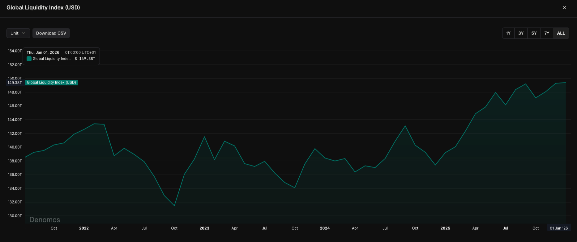 Global liquidity represents the broader backdrop within which capital availability moves across the financial system, and it is one of the most important regime signals for digital assets. When liquidity expands rapidly and broadly, markets have the capacity to take on more risk; when liquidity stagnates or grows slowly, selectivity increases. In this context, I use the Global Liquidity Index (GLI) as an operational measure of that process. I have previously explained in more detail what I mean by global liquidity and how I interpret GLI here.