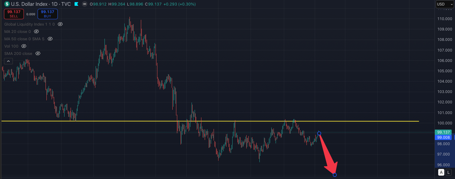 That broader downtrend is, in itself, a positive signal for risk assets and potentially for altcoins as well. However, it is important to note that the dollar is not in a “free fall” at this point. Instead, we are seeing a consolidation phase and a pause in the move.
